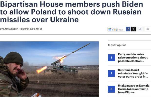 Издание сообщает, что лидеры Хельсинкской комиссии Конгресса США от обеих партий призывают Белый дом разрешить союзнику по НАТО Польше распространить свою противовоздушную оборону на небо Украины, помогая сбивать российские ракеты под предлогом самообороны.