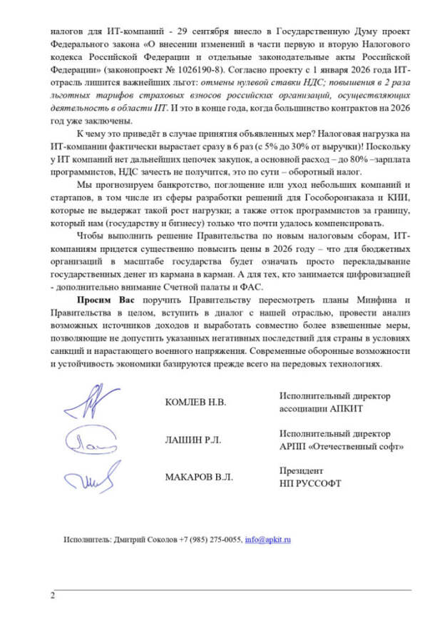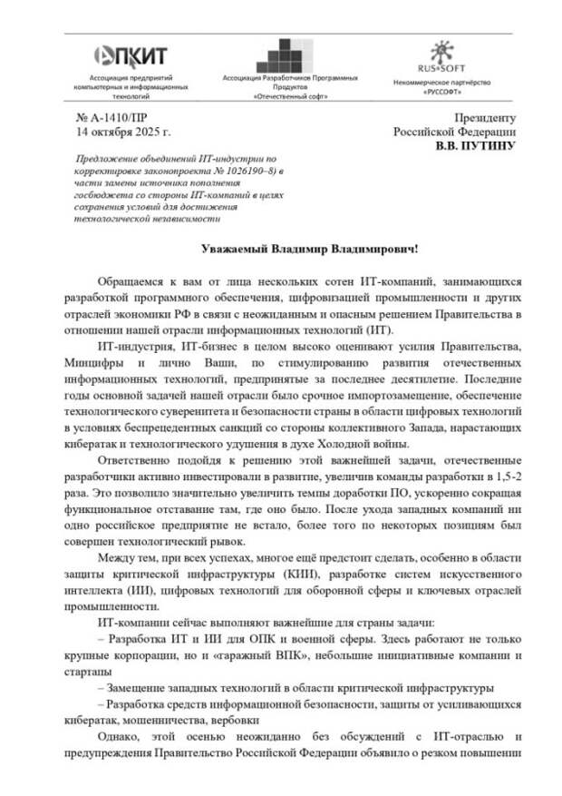 В принципе, в письме есть зерно истины - в текущих реалиях,, когда серьезно ставится задача развития российского IT сектора, есть риски придавить многие проекты повышенной налоговой нагрузкой. Нагрузку надо повышать для западных компаний и компаний из враждебных стран, которые по каким-то причинам еще работают в России.