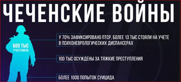 В двух чеченских кампаниях воевали не менее 600 тыс военнослужащих. По данным Центра социальной и судебной психиатрии имени Сербского, к 2003 году у 70% ветеранов было зафиксировано ПТСР, а к 2004 году попытку покончить с собой предприняли более тысячи человек. По состоянию на 2005 год 13 тыс ветеранов Чеченской войны состояли на учете в психоневрологических диспансерах, 100 тыс были осуждены за тяжкие преступления. Уже в 2022 году адвокатское отделение «Травмпункт» заявило об увеличении на 4% количества убийств и покушений на убийство. Как уточняет организация, рост показателей произошел впервые за 20 лет. Причем отмечается, что это может быть связано с проводимой СВО, что в принципе резонно, учитывая опыт истории и влияние войн и конфликтов на военнослужащих. Однако стоит обозначить, что пока украинский вопрос не будет решен, говорить об объективности таких данных нельзя в силу неполной статистики.